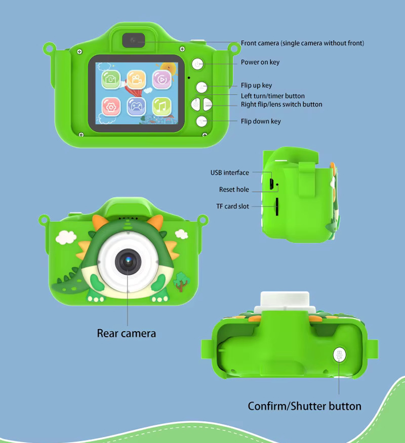 The Kiddomate DigiCam is built with simple, kid-friendly controls that make photography fun and frustration-free. A bright display, easy navigation buttons, and a durable, soft-touch body ensure kids can explore confidently. With a clear rear camera, USB charging port, TF card slot for expandable storage, and intuitive shutter button, this compact camera delivers everything young creators need to capture photos, record videos, and enjoy creative play—all in one adorable dino design.